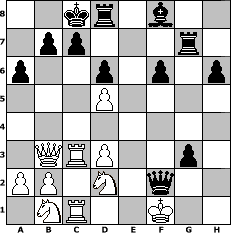 game notation in PGN-format [Event "Faires Schach"] [Site "www.myChess.de"] [Date "2007.03.25"] [Round "1"] [White "bluescreenlover"] [Black "Andreas"] [ECO "A00"] [WhitemyELO "1370"] [BlackmyELO "1619"] [Result "0-1"] [TimeControl "10/3456000"] [WhiteDays "110"] [BlackDays "116"] [MyChessNo "33713"] 1. Nc3 f5 2. e4 d6 3. Bc4 Nf6 4. exf5 Bxf5 5. Nf3 Nc6 6. d4 Nb4 7. Bd3 Nxd3+ 8. cxd3 Qd7 9. O-O h6 10. Be3 O-O-O 11. Rc1 Bg4 12. d5 g5 13. h3 Bh5 14. Bd4 Rg8 15. Qb3 Bxf3 16. Bxf6 exf6 17. gxf3 a6 18. Ne4 Qxh3 19. Qb6 Rg7 20. Rc3 Qxf3 21. Ned2 Qg4+ 22. Kh1 Qh3+ 23. Kg1 g4 24. Qb3 g3 25. Rfc1 Qh2+ 26. Kf1 Qxf2# 0-1 position notation in FEN-format 2kr1b2/1pp3r1/p2p1p1p/3P4/8/1QRP2p1/PP1N1q2/1NR2K2 - - - 0 27 Captured white pieces: Captured black pieces: Click on a captured piece in order to display the desired move!