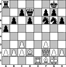 game notation in PGN-format [Event "1. mySchach Pfingst Open 2014"] [Site "www.myChess.de"] [Date "2014.06.08"] [Round "1"] [White "Grubengeist"] [Black "SibylleSchwerdt"] [ECO "C42"] [WhitemyELO "2008"] [BlackmyELO "1720"] [Result "1/2-1/2"] [TimeControl "10/3456000"] [WhiteDays "35"] [BlackDays "26"] [MyChessNo "94648"] 1. e4 e5 2. Nf3 Nf6 3. Nc3 Bb4 4. Nxe5 O-O 5. Be2 Re8 6. Nd3 Bxc3 7. dxc3 Nxe4 8. O-O d6 9. Re1 Nc6 10. Bf1 Nf6 11. Bg5 Rxe1 12. Qxe1 h6 13. Bd2 Bf5 14. f3 a5 15. Qg3 Bg6 16. Re1 b6 17. Qf2 Qd7 18. Nf4 Ne5 19. Nxg6 Nxg6 1/2-1/2 position notation in FEN-format r5k1/2pq1pp1/1p1p1nnp/p7/8/2P2P2/PPPB1QPP/4RBK1 - - - 0 20 Captured white pieces: Captured black pieces: Click on a captured piece in order to display the desired move!