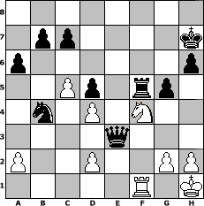 game notation in PGN-format [Event "CHESSMASTERS"] [Site "www.myChess.de"] [Date "2005.08.13"] [Round "1"] [White "thello"] [Black "Falcor"] [ECO "D06"] [WhitemyELO "1426"] [BlackmyELO "1473"] [Result "0-1"] [TimeControl "10/2592000"] [WhiteDays "120"] [BlackDays "116"] [MyChessNo "16180"] 1. d4 d5 2. c4 Nf6 3. Nc3 e6 4. Bg5 h6 5. Bxf6 Qxf6 6. e3 Bb4 7. Nf3 Nc6 8. Be2 Bxc3+ 9. bxc3 O-O 10. cxd5 exd5 11. Bb5 Bg4 12. Be2 Rfe8 13. O-O Ne7 14. Ne5 Bxe2 15. Qxe2 Rad8 16. Ng4 Qc6 17. Rac1 a6 18. Qf3 Rd6 19. Ne5 Qa4 20. Qxf7+ Kh7 21. f4 Rf6 22. Qxe8 Qxe8 23. c4 Qa4 24. Rf2 g5 25. c5 Nc6 26. Ng4 Rf7 27. f5 Nb4 28. Ne5 Rf8 29. Ng6 Rf6 30. Rd1 Qxd1+ 31. Rf1 Qd3 32. Nf4 Qxe3+ 33. Kh1 Rxf5 0-1 position notation in FEN-format 8/1pp4k/p6p/2Pp1rp1/1n1P1N2/4q3/P2P2PP/5R1K - - - 0 34 Captured white pieces: Captured black pieces: Click on a captured piece in order to display the desired move!