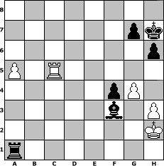 game notation in PGN-format [Event "> 1500"] [Site "www.myChess.de"] [Date "2010.03.18"] [Round "1"] [White "alpacino"] [Black "Andylein1989"] [ECO "A00"] [WhitemyELO "1290"] [BlackmyELO "1503"] [Result "0-1"] [TimeControl "10/2592000"] [WhiteDays "133"] [BlackDays "092"] [MyChessNo "64081"] 1. Nc3 Nf6 2. e3 Nc6 3. Qf3 e5 4. Bb5 a6 5. Bxc6 bxc6 6. Rb1 Bb7 7. Qf5 d6 8. Nf3 Be7 9. Qg5 O-O 10. b4 Nd5 11. Qg4 Nxc3 12. dxc3 h6 13. e4 Bc8 14. Qh5 Be6 15. a4 Kh7 16. Be3 Qc8 17. h3 Rb8 18. O-O Qd7 19. Rfd1 Bc4 20. Nxe5 Qe6 21. Nxc6 Rb7 22. Qf5+ Qxf5 23. exf5 Bf6 24. Nd4 Bxd4 25. cxd4 Re8 26. d5 Re5 27. a5 Rxf5 28. g4 Rxd5 29. Rxd5 Bxd5 30. Bd4 c5 31. Be3 Be4 32. Rd1 cxb4 33. Rxd6 Bxc2 34. Rxa6 b3 35. Bc1 b2 36. Bxb2 Rxb2 37. Rb6 Ra2 38. Rc6 Be4 39. Rc4 f5 40. Rc5 Ra1+ 41. Kh2 f4 42. f3 Bxf3 0-1 position notation in FEN-format 8/6pk/7p/P1R5/5pP1/5b1P/7K/r7 - - - 0 43 Captured white pieces: Captured black pieces: Click on a captured piece in order to display the desired move!