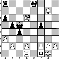 game notation in PGN-format [Event "Ostdeutschland"] [Site "www.myChess.de"] [Date "2008.08.12"] [Round "1"] [White "Gauss1233"] [Black "Damenmatt"] [ECO "D20"] [WhitemyELO "1380"] [BlackmyELO "1479"] [Result "1-0"] [TimeControl "10/2592000"] [WhiteDays "120"] [BlackDays "093"] [MyChessNo "47085"] 1. d4 d5 2. c4 dxc4 3. e4 Nf6 4. e5 Nd5 5. Bxc4 e6 6. Nc3 Bb4 7. Qc2 Nc6 8. Nge2 a6 9. a3 Nxd4 10. Nxd4 Be7 11. Nxd5 exd5 12. Bb3 c5 13. Nf5 O-O 14. O-O c4 15. Ba2 Bxf5 16. Qxf5 Qc7 17. Bf4 d4 18. e6 Qc6 19. Qg4 fxe6 20. Be5 Rf7 21. Bxd4 g6 22. Rac1 b5 23. Bb1 Bg5 24. Qxg5 Rf5 25. Bxf5 exf5 26. Qe7 Qe8 27. Qf6 Qf8 28. Qh8+ Kf7 29. Qxh7+ Ke6 30. Qxg6+ Kd5 31. Bg7 Qe8 32. Rcd1+ Kc5 33. Qd6# 1-0 position notation in FEN-format r3q3/6B1/p2Q4/1pk2p2/2p5/P7/1P1P1PPP/3R1RK1 - - - 6 33 Captured white pieces: ![]() ![]() ![]() ![]() ![]() ![]() ![]() ![]() ![]() ![]() ![]() ![]() ![]() ![]() ![]() Captured black pieces: ![]() ![]() ![]() ![]() ![]() ![]() ![]() ![]() ![]() ![]() ![]() ![]() ![]() ![]() ![]() Click on a captured piece in order to display the desired move!