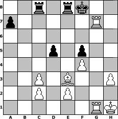 game notation in PGN-format [Event "Prätorianer"] [Site "www.myChess.de"] [Date "2023.01.04"] [Round "1"] [White "lotchi"] [Black "Master1"] [ECO "B12"] [WhitemyELO "1229"] [BlackmyELO "1340"] [Result "0-1"] [TimeControl "10/1728000"] [WhiteDays "00"] [BlackDays "16"] [MyChessNo "128879"] 1. e4 c6 2. d4 d5 3. e5 Bf5 4. g4 Be4 5. Nf3 e6 6. Nc3 Bb4 7. Bd2 Qb6 8. a3 Bxf3 9. Qxf3 Bxc3 10. bxc3 Ne7 11. Bd3 O-O 12. O-O Nd7 13. Rfb1 Qc7 14. Qh3 h6 15. g5 b5 16. gxh6 g6 17. h7+ Kh8 18. f4 Rfe8 19. Kh1 Nf8 20. Rf1 Nf5 21. Bxf5 exf5 22. a4 bxa4 23. Rxa4 c5 24. Qf3 Qc6 25. Raa1 Nxh7 26. dxc5 Qxc5 27. Qf2 Qxf2 28. Rxf2 f6 29. exf6 Nxf6 30. Rg2 Kg7 31. Rag1 Ng4 32. h3 Ne3 33. Rxg6+ Kf7 34. Rg7+ Kf8 35. Bxe3 Rac8 0-1 position notation in FEN-format 2r1rk2/p5R1/8/3p1p2/5P2/2P1B2P/2P1P3/6RK - - - 1 36 Captured white pieces: Captured black pieces: Click on a captured piece in order to display the desired move!