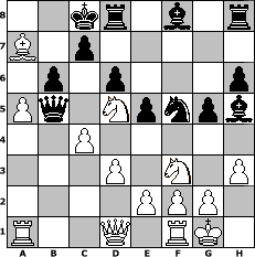game notation in PGN-format [Event "Vor dem Urlaub noch ein schnelles Turnier!"] [Site "www.myChess.de"] [Date "2012.06.16"] [Round "1"] [White "Sanji"] [Black "reisender"] [ECO "C50"] [WhitemyELO "1547"] [BlackmyELO "1346"] [Result "1-0"] [TimeControl "10/864000"] [WhiteDays "06"] [BlackDays "00"] [MyChessNo "82250"] 1. e4 e5 2. Nf3 Nc6 3. Bc4 h6 4. O-O d6 5. Nc3 Bg4 6. h3 Bh5 7. d3 Qd7 8. Be3 O-O-O 9. b4 g5 10. b5 Nce7 11. a4 f5 12. exf5 Nxf5 13. Bxa7 b6 14. Bd5 Nge7 15. a5 Nxd5 16. Nxd5 Qxb5 17. c4 1-0 position notation in FEN-format 2kr1b1r/B1p5/1p1p3p/Pq1Npnpb/2P5/3P1N1P/4PPP1/R2Q1RK1 - - - 0 17 Captured white pieces: Captured black pieces: Click on a captured piece in order to display the desired move!