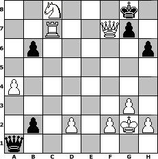 game notation in PGN-format [Event "Kellertunier"] [Site "www.myChess.de"] [Date "2005.08.15"] [Round "1"] [White "thello"] [Black "Pocket"] [ECO "D10"] [WhitemyELO "1394"] [BlackmyELO "1282"] [Result "1-0"] [TimeControl "10/864000"] [WhiteDays "10"] [BlackDays "10"] [MyChessNo "16246"] 1. d4 d5 2. c4 c6 3. Nc3 Nf6 4. Bg5 Be6 5. Bxf6 exf6 6. e4 Be7 7. cxd5 cxd5 8. Bb5+ Nd7 9. Nf3 O-O 10. Bxd7 Qxd7 11. O-O b6 12. Re1 Rad8 13. e5 Rfe8 14. a3 Bg4 15. exf6 Bxf6 16. Qd3 Bxf3 17. Rxe8+ Rxe8 18. Qxf3 Qe7 19. Kf1 Bg5 20. Nxd5 Qd6 21. Rd1 h6 22. b4 Rc8 23. g3 Bc1 24. a4 a5 25. Re1 axb4 26. Ne7+ Kf8 27. Nxc8 Qxd4 28. Rxc1 Qb2 29. Qe3 b3 30. Qe7+ Kg8 31. Rc7 Qa1+ 32. Kg2 b2 33. Qxf7+ 1-0 position notation in FEN-format 2N3k1/2R2Qp1/1p5p/8/P7/6P1/1p1P1PKP/q7 - - - 0 33 Captured white pieces: ![]() ![]() ![]() ![]() ![]() ![]() ![]() ![]() ![]() ![]() ![]() ![]() ![]() ![]() ![]() Captured black pieces: ![]() ![]() ![]() ![]() ![]() ![]() ![]() ![]() ![]() ![]() ![]() ![]() ![]() ![]() ![]() Click on a captured piece in order to display the desired move!