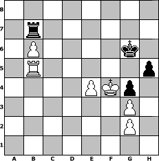 game notation in PGN-format [Event "Dabei ist alles 2"] [Site "www.myChess.de"] [Date "2008.04.04"] [Round "1"] [White "Joschi"] [Black "Naunhofer"] [ECO "B44"] [WhitemyELO "1567"] [BlackmyELO "1675"] [Result "1-0"] [TimeControl "10/864000"] [WhiteDays "10"] [BlackDays "10"] [MyChessNo "44056"] 1. e4 c5 2. Nf3 e6 3. d4 cxd4 4. Nxd4 Nc6 5. Nxc6 bxc6 6. Be2 Bc5 7. O-O Ne7 8. c4 O-O 9. Nc3 d5 10. cxd5 cxd5 11. exd5 Nxd5 12. Ne4 Bb6 13. Bg5 f6 14. Bh4 Bb7 15. Bf3 g5 16. Bg3 f5 17. Nd6 Qe7 18. Nxb7 f4 19. Bxd5 fxg3 20. hxg3 exd5 21. Qxd5+ Rf7 22. Na5 Raf8 23. Nc4 Qc5 24. Qxc5 Bxc5 25. Ne3 h5 26. Rae1 Kg7 27. a3 Kg6 28. b4 Bd4 29. Nd1 Bb6 30. Re6+ Kg7 31. Re5 Kg6 32. a4 Bc7 33. Re6+ Kg7 34. Ne3 Bb6 35. a5 Bd4 36. b5 Rf6 37. Rxf6 Rxf6 38. Rd1 Bxe3 39. fxe3 Rf5 40. Rb1 Rc5 41. b6 axb6 42. axb6 Rc8 43. Rb5 Kf6 44. Kf2 Rb8 45. Kf3 Rb7 46. Ke4 g4 47. Kf4 Kg6 48. e4 Rf7+ 49. Ke3 Rb7 50. Kf4 1-0 position notation in FEN-format 8/1r6/1P4k1/1R5p/4PKp1/6P1/6P1/8 - - - 4 50 Captured white pieces: Captured black pieces: Click on a captured piece in order to display the desired move!