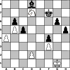game notation in PGN-format [Event "Herbst 2016"] [Site "www.myChess.de"] [Date "2016.09.13"] [Round "1"] [White "augustus"] [Black "Caligula"] [ECO "E00"] [WhitemyELO "1200"] [BlackmyELO "1351"] [Result "1-0"] [TimeControl "10/1728000"] [WhiteDays "44"] [BlackDays "00"] [MyChessNo "104912"] 1. d4 Nf6 2. c4 e6 3. a3 b6 4. Bg5 Be7 5. Nc3 Bb7 6. Bxf6 Bxf6 7. e4 d6 8. b4 Nc6 9. e5 dxe5 10. d5 exd5 11. Qxd5 Qxd5 12. Nxd5 Bd8 13. Rd1 O-O 14. Bd3 Re8 15. Be4 Rb8 16. Nf3 f6 17. O-O Ne7 18. Nxe7+ Bxe7 19. Bxb7 Rxb7 20. Nh4 a6 21. Nf5 Bd8 22. Rfe1 g6 23. Nh6+ Kg7 24. Ng4 h5 25. Ne3 c6 26. h4 f5 27. g3 f4 28. gxf4 exf4 29. Nc2 Rxe1+ 30. Nxe1 Bxh4 31. Nf3 Be7 32. Ne5 c5 33. b5 axb5 34. cxb5 Bf6 35. Rd7+ Rxd7 36. Nxd7 Bd8 37. f3 Kh6 38. a4 Kg5 39. Ne5 Kf5 40. Nd7 Ke6 41. Nf8+ Kf7 42. Nd7 1-0 position notation in FEN-format 3b4/3N1k2/1p4p1/1Pp4p/P4p2/5P2/3P4/6K1 - - - 8 42 Captured white pieces: ![]() ![]() ![]() ![]() ![]() ![]() ![]() ![]() ![]() ![]() ![]() ![]() ![]() ![]() ![]() Captured black pieces: ![]() ![]() ![]() ![]() ![]() ![]() ![]() ![]() ![]() ![]() ![]() ![]() ![]() ![]() ![]() Click on a captured piece in order to display the desired move!