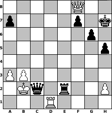 game notation in PGN-format [Event "FREUNDESTUNIER"] [Site "www.myChess.de"] [Date "2005.10.28"] [Round "2"] [White "icke"] [Black "Biber"] [ECO "C26"] [WhitemyELO "1343"] [BlackmyELO "1211"] [Result "1/2-1/2"] [TimeControl "10/864000"] [WhiteDays "39"] [BlackDays "39"] [MyChessNo "19031"] 1. e4 e5 2. Nc3 Nf6 3. Nf3 Nc6 4. d4 exd4 5. Nxd4 Bb4 6. Bd2 Nxd4 7. a3 Bxc3 8. Bxc3 c5 9. Bxd4 cxd4 10. Qxd4 d5 11. exd5 O-O 12. d6 Qd7 13. Be2 Rd8 14. Rd1 b6 15. Bf3 Bb7 16. Bxb7 Qxb7 17. Qa4 Qxg2 18. Kd2 Qxf2+ 19. Kc1 b5 20. Qxb5 Qb6 21. Qe5 Rd7 22. Rhe1 Re8 23. Qg3 g6 24. Qc3 Re4 25. Qxf6 Rxd6 26. Qc3 Rxd1+ 27. Rxd1 h5 28. Qd3 Qe6 29. b3 Qf5 30. Qd8+ Kh7 31. Kb2 Re2 32. Qf8 Qxc2+ 1/2-1/2 position notation in FEN-format 5Q2/p4p1k/6p1/7p/8/PP6/1Kq1r2P/3R4 - - - 0 33 Captured white pieces: Captured black pieces: Click on a captured piece in order to display the desired move!