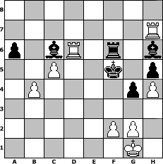 game notation in PGN-format [Event "\"Die Weinlese 2o12\""] [Site "www.myChess.de"] [Date "2012.09.22"] [Round "1"] [White "zoli"] [Black "grazy"] [ECO "C78"] [WhitemyELO "1813"] [BlackmyELO "1769"] [Result "1-0"] [TimeControl "10/1728000"] [WhiteDays "10"] [BlackDays "19"] [MyChessNo "84076"] 1. e4 e5 2. Nf3 Nc6 3. Bb5 a6 4. Ba4 Nf6 5. O-O Bd6 6. Re1 b5 7. Bb3 O-O 8. Nc3 Bb7 9. d3 Na5 10. Bg5 h6 11. Bh4 Re8 12. Qd2 Nxb3 13. axb3 Bf8 14. Nd5 g5 15. Nxf6+ Qxf6 16. Bg3 d6 17. h3 Bg7 18. b4 Qe6 19. Re3 f5 20. exf5 Qxf5 21. Qc3 Qf7 22. Qe1 Rf8 23. Nd2 h5 24. Ne4 Qg6 25. Qd1 Bh6 26. Re1 Rf7 27. Bh2 Raf8 28. Re2 Kg7 29. Qe1 g4 30. h4 Qe6 31. Bg3 Qd5 32. Rd1 Kg6 33. c3 Re8 34. Qf1 Qe6 35. Rde1 Qd5 36. Rd1 Qe6 37. Rde1 Qd5 38. Rd1 Ree7 39. Rc2 Rf8 40. Qe2 Kg7 41. Ra1 Ref7 42. Qd1 Qb3 43. Ra3 Qe6 44. Re2 Rf5 45. Ra1 Qf7 46. Qc2 Qd5 47. Rae1 Kg8 48. Rf1 Kg7 49. b3 Re8 50. Rd1 Rf7 51. d4 exd4 52. Rxd4 Qc6 53. c4 Re6 54. Rd5 Qe8 55. Bxd6 cxd6 56. Nxd6 Qe7 57. Qc3+ Qf6 58. Qxf6+ Rexf6 59. Ne8+ Kg6 60. Nxf6 Rxf6 61. Rd8 bxc4 62. bxc4 Bc6 63. c5 Kf5 64. Re7 Be4 65. Rd6 Bc6 66. Rh7 1-0 position notation in FEN-format 8/7R/p1bR1r1b/2P2k1p/1P4pP/8/5PP1/6K1 - - - 6 66 Captured white pieces: Captured black pieces: Click on a captured piece in order to display the desired move!