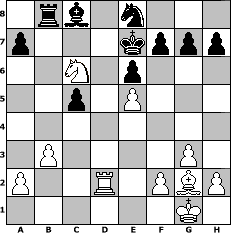 game notation in PGN-format [Event "4. Norderstedter DENK MAL Open 2013"] [Site "www.myChess.de"] [Date "2013.01.09"] [Round "1"] [White "haggard"] [Black "FrankB"] [ECO "A13"] [WhitemyELO "1985"] [BlackmyELO "1518"] [Result "1-0"] [TimeControl "10/2592000"] [WhiteDays "30"] [BlackDays "30"] [MyChessNo "86070"] 1. c4 e6 2. g3 Nf6 3. Bg2 c5 4. Nf3 Nc6 5. O-O Be7 6. b3 O-O 7. Bb2 Qc7 8. d4 d5 9. cxd5 Nxd5 10. dxc5 Bxc5 11. Nbd2 Rd8 12. Rc1 Qe7 13. Qc2 Ba3 14. Bxa3 Qxa3 15. Nc4 Qe7 16. Rfd1 Bd7 17. Qb2 Rac8 18. e4 Nc7 19. Nd6 Rb8 20. e5 Ne8 21. Qd2 Bc8 22. Rxc6 bxc6 23. Nf5 Rxd2 24. Nxe7+ Kf8 25. Rxd2 Kxe7 26. Nd4 c5 27. Nc6+ 1-0 position notation in FEN-format 1rb1n3/p3kppp/2N1p3/2p1P3/8/1P4P1/P2R1PBP/6K1 - - - 1 27 Captured white pieces: Captured black pieces: Click on a captured piece in order to display the desired move!