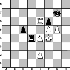 game notation in PGN-format [Event "Eine zentrale Er"] [Site "www.myChess.de"] [Date "2009.05.20"] [Round "1"] [White "sel"] [Black "Knight"] [ECO "C68"] [WhitemyELO "1325"] [BlackmyELO "1098"] [Result "1-0"] [TimeControl "10/2592000"] [WhiteDays "149"] [BlackDays "147"] [MyChessNo "55908"] 1. e4 e5 2. Nf3 Nc6 3. Bb5 a6 4. Bxc6 dxc6 5. Nc3 Bg4 6. h3 Bh5 7. g4 Bg6 8. Nxe5 Nf6 9. Nxg6 hxg6 10. Qf3 Bb4 11. a3 Bxc3 12. bxc3 O-O 13. d3 g5 14. Bxg5 Re8 15. Bxf6 Qxf6 16. Qxf6 gxf6 17. c4 c5 18. a4 a5 19. Rb1 b6 20. Kd2 Rad8 21. Rbe1 Re5 22. f3 Kf8 23. h4 c6 24. h5 Kg8 25. f4 Ree8 26. f5 Kh7 27. h6 Rg8 28. Rh4 Rb8 29. Ke3 b5 30. cxb5 cxb5 31. axb5 Rxb5 32. c4 Rb3 33. Ra1 Rd8 34. Rd1 a4 35. Rh2 a3 36. Kf4 Rdxd3 37. Rxd3 Rxd3 38. Ra2 Rd4 39. Rxa3 Rxc4 40. Ra6 Kxh6 41. Rxf6+ Kg7 42. Rc6 f6 43. Rc7+ Kh6 44. Rc6 Kg7 45. Re6 Rd4 46. g5 1-0 position notation in FEN-format 8/6k1/4Rp2/2p2PP1/3rPK2/8/4P3/8 - - - 0 46 Captured white pieces: Captured black pieces: Click on a captured piece in order to display the desired move!