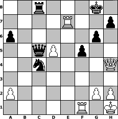 game notation in PGN-format [Event "Scottish Open"] [Site "www.myChess.de"] [Date "2007.10.22"] [Round "1"] [White "nogumo"] [Black "bernhard"] [ECO "A00"] [WhitemyELO "1622"] [BlackmyELO "1614"] [Result "1-0"] [TimeControl "10/864000"] [WhiteDays "40"] [BlackDays "32"] [MyChessNo "39166"] 1. b4 e5 2. Bb2 d6 3. e3 a6 4. Nf3 Nf6 5. c4 Bf5 6. Be2 Be7 7. Nc3 O-O 8. O-O c5 9. bxc5 dxc5 10. Nxe5 Bd6 11. d4 cxd4 12. exd4 Re8 13. f4 Nc6 14. Nxc6 bxc6 15. Bf3 Rc8 16. Ne2 Qc7 17. d5 Bc5+ 18. Kh1 Ne4 19. Be5 Bd6 20. Nd4 Bxe5 21. fxe5 Qxe5 22. Nxc6 Qd6 23. Bh5 g6 24. Bg4 Bxg4 25. Qxg4 Qc5 26. Qf4 Nd6 27. Rae1 f5 28. Ne7+ Rxe7 29. Rxe7 Nxc4 30. Qh4 1-0 position notation in FEN-format 2r3k1/4R2p/p5p1/2qP1p2/2n4Q/8/P5PP/5R1K - - - 1 30 Captured white pieces: Captured black pieces: Click on a captured piece in order to display the desired move!
