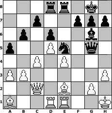 game notation in PGN-format [Event "Fernschachmeisterschaft Sfr. Heimersheim 2007"] [Site "www.myChess.de"] [Date "2007.01.21"] [Round "2"] [White "paula"] [Black "Devine"] [ECO "A17"] [WhitemyELO "1716"] [BlackmyELO "2040"] [Result "1/2-1/2"] [TimeControl "10/2592000"] [WhiteDays "04"] [BlackDays "23"] [MyChessNo "31884"] 1. c4 Nf6 2. Nc3 e6 3. Nf3 Bb4 4. Qc2 O-O 5. a3 Bxc3 6. Qxc3 b6 7. b3 Bb7 8. Bb2 d6 9. e3 Nbd7 10. Be2 e5 11. d4 Ne4 12. Qc2 Qe7 13. Rd1 Rad8 14. Ba1 Rfe8 15. O-O a5 16. Rfe1 Ng5 17. Nxg5 Qxg5 18. d5 Bc8 19. Bd3 Nf6 20. f4 Qh5 21. fxe5 Ng4 22. h3 Nxe5 23. Be2 Qg5 24. Kh1 Bf5 25. e4 Bg6 1/2-1/2 position notation in FEN-format 3rr1k1/2p2ppp/1p1p2b1/p2Pn1q1/2P1P3/PP5P/2Q1B1P1/B2RR2K - - - 1 26 Captured white pieces: ![]() ![]() ![]() ![]() ![]() ![]() ![]() ![]() ![]() ![]() ![]() ![]() ![]() ![]() ![]() Captured black pieces: ![]() ![]() ![]() ![]() ![]() ![]() ![]() ![]() ![]() ![]() ![]() ![]() ![]() ![]() ![]() Click on a captured piece in order to display the desired move!