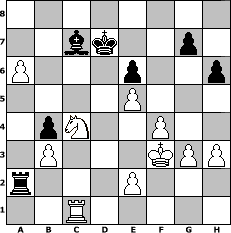 game notation in PGN-format [Event "Sommerschach 2009"] [Site "www.myChess.de"] [Date "2009.06.09"] [Round "2"] [White "muellerh"] [Black "ujack1961"] [ECO "C68"] [WhitemyELO "1565"] [BlackmyELO "1639"] [Result "1/2-1/2"] [TimeControl "10/864000"] [WhiteDays "08"] [BlackDays "09"] [MyChessNo "56489"] 1. e4 e5 2. Nf3 Nc6 3. Bb5 a6 4. Bc4 Nd4 5. d3 Nxf3+ 6. Qxf3 Qf6 7. Qxf6 Nxf6 8. O-O b5 9. Bb3 Bc5 10. h3 a5 11. a4 b4 12. Re1 c6 13. c3 O-O 14. Bg5 Be7 15. d4 exd4 16. cxd4 h6 17. Bh4 d6 18. e5 dxe5 19. dxe5 Nd5 20. Bxd5 Bxh4 21. Bxc6 Ra6 22. Bd5 Be6 23. Bxe6 fxe6 24. g3 Be7 25. Nd2 Rc6 26. Rac1 Rfc8 27. Rxc6 Rxc6 28. b3 Rc2 29. Nc4 Bd8 30. Rd1 Be7 31. Nxa5 Bc5 32. Rf1 Rc3 33. Kg2 Kf7 34. f4 Bb6 35. Nc4 Bc7 36. Rd1 Ke7 37. Rb1 Kd7 38. a5 Kc6 39. a6 Rc2+ 40. Kf3 Ra2 41. Rc1 Kd7 1/2-1/2 position notation in FEN-format 8/2bk2p1/P3p2p/4P3/1pN2P2/1P3KPP/r3P3/2R5 - - - 5 42 Captured white pieces: Captured black pieces: Click on a captured piece in order to display the desired move!