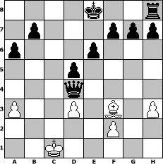 game notation in PGN-format [Event "9er5"] [Site "www.myChess.de"] [Date "2015.01.04"] [Round "1"] [White "borsti"] [Black "Joschi"] [ECO "B12"] [WhitemyELO "1325"] [BlackmyELO "1596"] [Result "0-1"] [TimeControl "10/3456000"] [WhiteDays "40"] [BlackDays "40"] [MyChessNo "97413"] 1. e4 c6 2. d4 d5 3. e5 Bf5 4. g4 Bd7 5. Nf3 Bxg4 6. Bg2 e6 7. h3 Bh5 8. Qd3 Nd7 9. Be3 Rc8 10. Nbd2 a6 11. Nb3 c5 12. Qe2 cxd4 13. Bxd4 Ne7 14. O-O-O Nc6 15. Bc3 Qc7 16. Rhe1 Bb4 17. a3 Bxc3 18. bxc3 Ncxe5 19. Qxe5 Nxe5 20. Rxe5 Bxf3 21. Bxf3 Qxe5 22. Nd4 Rxc3 23. Rd3 Rxd3 24. cxd3 Qxd4 0-1 position notation in FEN-format 4k2r/1p3ppp/p3p3/3p4/3q4/P2P1B1P/5P2/2K5 - k - 0 25 Captured white pieces: Captured black pieces: Click on a captured piece in order to display the desired move!