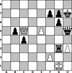 game notation in PGN-format [Event "Sp"] [Site "www.myChess.de"] [Date "2011.09.07"] [Round "1"] [White "Greenhorn"] [Black "Mestengo"] [ECO "D21"] [WhitemyELO "1504"] [BlackmyELO "1529"] [Result "0-1"] [TimeControl "10/1728000"] [WhiteDays "18"] [BlackDays "17"] [MyChessNo "76185"] 1. d4 d5 2. c4 dxc4 3. Nf3 b5 4. a4 c6 5. e3 Bg4 6. axb5 cxb5 7. Nbd2 Nd7 8. h3 Bf5 9. e4 Bg6 10. Nh4 Qb6 11. Nxg6 hxg6 12. Nb1 e5 13. Be3 Bb4+ 14. Nc3 Qe6 15. Be2 Bxc3+ 16. bxc3 exd4 17. Qxd4 Ngf6 18. Rxa7 O-O 19. Rxa8 Rxa8 20. O-O Ra2 21. Bf3 Ne5 22. Rd1 Nxf3+ 23. gxf3 Kh7 24. e5 Nh5 25. Kh2 Ra3 26. f4 Qf5 27. Qc5 Nxf4 28. Bxf4 Qxf4+ 29. Kg1 Rxc3 30. Rd4 Qg5+ 31. Rg4 Qh5 32. Rg3 Rxg3+ 0-1 position notation in FEN-format 8/5ppk/6p1/1pQ1P2q/2p5/6rP/5P2/6K1 - - - 0 33 Captured white pieces: Captured black pieces: Click on a captured piece in order to display the desired move!