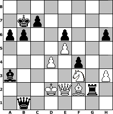 game notation in PGN-format [Event "M"] [Site "www.myChess.de"] [Date "2012.07.12"] [Round "1"] [White "Ziegert"] [Black "Stoertebecker"] [ECO "C30"] [WhitemyELO "1484"] [BlackmyELO "1699"] [Result "0-1"] [TimeControl "10/3456000"] [WhiteDays "12"] [BlackDays "40"] [MyChessNo "82725"] 1. e4 e5 2. f4 d6 3. Nf3 Nc6 4. Nc3 Be7 5. Bc4 exf4 6. d3 g5 7. h3 h6 8. Bd2 Nf6 9. Qe2 Be6 10. Bxe6 fxe6 11. O-O-O Qd7 12. e5 Nh5 13. Be1 d5 14. Nd2 Ng7 15. Nf3 Nf5 16. Bf2 d4 17. Ne4 O-O-O 18. g3 Ne3 19. a3 Nxd1 20. Rxd1 Qd5 21. Kb1 Rhg8 22. Rg1 b6 23. gxf4 gxf4 24. Rxg8 Rxg8 25. c3 dxc3 26. Nxc3 Qd7 27. Nb5 Kb7 28. Nfd4 a6 29. Nxc6 Qxc6 30. Nd4 Qh1+ 31. Ka2 Qd5+ 32. b3 Rg2 33. Nf3 Qc5 34. d4 Qxa3+ 35. Kb1 Qxb3+ 36. Kc1 Ba3+ 37. Kd2 Qb1 0-1 position notation in FEN-format 8/1kp5/pp2p2p/4P3/3P1p2/b4N1P/3KQBr1/1q6 - - - 4 38 Captured white pieces: Captured black pieces: Click on a captured piece in order to display the desired move!