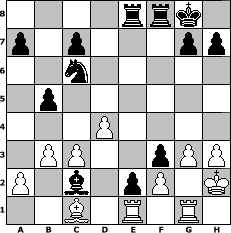 game notation in PGN-format [Event "Neujahrstunier"] [Site "www.myChess.de"] [Date "2010.12.23"] [Round "1"] [White "Joschi"] [Black "pepo47"] [ECO "C42"] [WhitemyELO "1527"] [BlackmyELO "1811"] [Result "0-1"] [TimeControl "10/2592000"] [WhiteDays "82"] [BlackDays "88"] [MyChessNo "70743"] 1. e4 e5 2. Nf3 Nf6 3. Nxe5 d6 4. Nf3 Nxe4 5. d4 d5 6. h3 Bb4+ 7. c3 Bd6 8. Bd3 O-O 9. O-O Bf5 10. Be3 Qf6 11. Qc2 Nc6 12. Nbd2 Rae8 13. Rae1 Bg6 14. Bxe4 dxe4 15. Nh2 Qe6 16. b3 f5 17. Nc4 Bxh2+ 18. Kxh2 f4 19. Bc1 b5 20. Nb2 f3 21. g3 e3 22. Nd3 e2 23. Rg1 Qe4 24. Nb4 Qxc2 25. Nxc2 Bxc2 0-1 position notation in FEN-format 4rrk1/p1p3pp/2n5/1p6/3P4/1PP2pPP/P1b1pP1K/2B1R1R1 - - - 0 26 Captured white pieces: Captured black pieces: Click on a captured piece in order to display the desired move!
