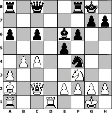 game notation in PGN-format [Event "Vierspringerspiel"] [Site "www.myChess.de"] [Date "2008.10.27"] [Round "2"] [White "DreiZweiEinsSchach"] [Black "Schmalte"] [ECO "C49"] [WhitemyELO "1138"] [BlackmyELO "1468"] [Result "0-1"] [TimeControl "10/2592000"] [WhiteDays "00"] [BlackDays "49"] [MyChessNo "49200"] 1. e4 e5 2. Nf3 Nc6 3. Nc3 Nf6 4. Bb5 Bb4 5. O-O O-O 6. d3 d6 7. Bd2 Ne7 8. a3 Bxc3 9. Bxc3 a6 10. Bc4 b5 11. Ba2 c6 12. b4 Ng6 13. Ne1 d5 14. exd5 Nxd5 15. Bd2 Be6 16. c4 bxc4 17. dxc4 Ndf4 18. Bxf4 Nxf4 19. Nf3 f6 20. Qc2 Qd7 21. Rfd1 Qc8 0-1 position notation in FEN-format r1q2rk1/6pp/p1p1bp2/4p3/1PP2n2/P4N2/B1Q1PPPP/R2R2K1 - - - 4 22 Captured white pieces: Captured black pieces: Click on a captured piece in order to display the desired move!