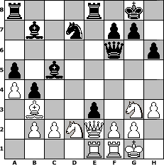 game notation in PGN-format [Event "Gegen die Herbstdepression"] [Site "www.myChess.de"] [Date "2008.12.01"] [Round "1"] [White "Helmut48"] [Black "ujack1961"] [ECO "C24"] [WhitemyELO "1394"] [BlackmyELO "1622"] [Result "0-1"] [TimeControl "10/864000"] [WhiteDays "10"] [BlackDays "10"] [MyChessNo "50354"] 1. e4 e5 2. Bc4 Nf6 3. d3 Bc5 4. h3 c6 5. Nc3 O-O 6. Bg5 h6 7. Bxf6 Qxf6 8. Nf3 b5 9. Bb3 a5 10. a4 b4 11. Ne2 Bb7 12. Ng3 d5 13. exd5 cxd5 14. O-O Nd7 15. Qe2 Rfe8 16. Rae1 e4 17. dxe4 dxe4 18. Nd2 e3 0-1 position notation in FEN-format r3r1k1/1b1n1pp1/5q1p/p1b5/Pp6/1B2p1NP/1PPNQPP1/4RRK1 - - - 0 19 Captured white pieces: ![]() ![]() ![]() ![]() ![]() ![]() ![]() ![]() ![]() ![]() ![]() ![]() ![]() ![]() ![]() Captured black pieces: ![]() ![]() ![]() ![]() ![]() ![]() ![]() ![]() ![]() ![]() ![]() ![]() ![]() ![]() ![]() Click on a captured piece in order to display the desired move!