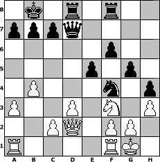 game notation in PGN-format [Event "Gelegenheitsspieler mit kleinem Zeitbudget"] [Site "www.myChess.de"] [Date "2010.06.24"] [Round "1"] [White "MStr"] [Black "Haki"] [ECO "B01"] [WhitemyELO "1299"] [BlackmyELO "1274"] [Result "0-1"] [TimeControl "10/3456000"] [WhiteDays "000"] [BlackDays "113"] [MyChessNo "66549"] 1. e4 d5 2. exd5 Qxd5 3. Nc3 Qa5 4. a3 e5 5. Bb5+ Bd7 6. Bxd7+ Nxd7 7. Nf3 O-O-O 8. O-O f6 9. d3 Ne7 10. Bd2 h5 11. Ne4 Qd5 12. Bc3 h4 13. h3 Nb6 14. Bb4 Ng6 15. Bxf8 Rhxf8 16. Nc3 Qd7 17. Qe2 Nf4 18. Qe4 Kb8 19. Ne2 Nxe2+ 20. Qxe2 g5 21. b4 Nd5 22. Qd2 Nf4 0-1 position notation in FEN-format 1k1r1r2/pppq4/5p2/4p1p1/1P3n1p/P2P1N1P/2PQ1PP1/R4RK1 - - - 3 23 Captured white pieces: Captured black pieces: Click on a captured piece in order to display the desired move!
