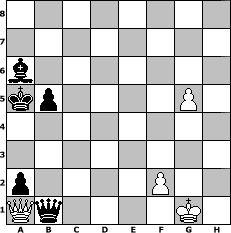 game notation in PGN-format [Event "PAL BENKO MEMORIAL TOURNAMENT"] [Site "www.myChess.de"] [Date "2019.09.05"] [Round "1"] [White "Gauss1233"] [Black "wolni55"] [ECO "D20"] [WhitemyELO "1431"] [BlackmyELO "1378"] [Result "0-1"] [TimeControl "10/3456000"] [WhiteDays "39"] [BlackDays "40"] [MyChessNo "115736"] 1. d4 d5 2. c4 dxc4 3. Nc3 h6 4. e4 e6 5. Bxc4 a6 6. a3 b5 7. Ba2 Bb7 8. Nf3 Nf6 9. e5 Nh7 10. d5 exd5 11. Nxd5 Bc5 12. Bf4 c6 13. Nc3 Qe7 14. O-O Nd7 15. Re1 O-O-O 16. Qe2 g5 17. e6 fxe6 18. Be3 g4 19. Nd2 Bxe3 20. Qxe3 Ng5 21. Bxe6 Nxe6 22. Qxe6 Qg7 23. Nde4 Kb8 24. Nd6 Nc5 25. Qf7 Qh7 26. Qf6 Rhf8 27. Qe5 Nd3 28. Qg3 Nxe1 29. Nf7+ Ka8 30. Nxd8 Rxd8 31. Rxe1 h5 32. Qh4 Rf8 33. Re7 Qc2 34. Re1 Qxb2 35. Qg3 Qxa3 36. Qe3 a5 37. Qd4 Qb2 38. Qe3 a4 39. Rb1 Qa3 40. Qd2 Qc5 41. Ne4 Qf5 42. Re1 Qf4 43. Qa5+ Kb8 44. Qb6 Re8 45. Qd4 c5 46. Qd3 Rxe4 47. Qd8+ Ka7 48. Qa5+ Ba6 49. Rxe4 Qxe4 50. Qc7+ Qb7 51. Qxc5+ Qb6 52. Qxh5 Qd4 53. h3 gxh3 54. Qxh3 Kb6 55. Qe6+ Ka5 56. g4 Qb2 57. Qe1+ Qb4 58. Qd1 a3 59. g5 a2 60. Qa1 Qb1+ 0-1 position notation in FEN-format 8/8/b7/kp4P1/8/8/p4P2/Qq4K1 - - - 2 61 Captured white pieces: Captured black pieces: Click on a captured piece in order to display the desired move!