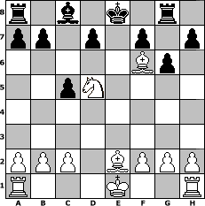game notation in PGN-format [Event "MySchachOpen"] [Site "www.myChess.de"] [Date "2005.01.22"] [Round "2"] [White "UPS"] [Black "Falcor"] [ECO "C45"] [WhitemyELO "1638"] [BlackmyELO "1337"] [Result "1-0"] [TimeControl "10/2592000"] [WhiteDays "60"] [BlackDays "57"] [MyChessNo "9907"] 1. e4 e5 2. Nf3 Nc6 3. d4 exd4 4. Nxd4 Nxd4 5. Qxd4 Nf6 6. Nc3 g6 7. Bg5 Bg7 8. e5 Qe7 9. Be2 c5 10. exf6 Bxf6 11. Qxf6 Qxf6 12. Bxf6 Rg8 13. Nd5 1-0 position notation in FEN-format r1b1k1r1/pp1p1p1p/5Bp1/2pN4/8/8/PPP1BPPP/R3K2R - KQq - 2 13 Captured white pieces: Captured black pieces: Click on a captured piece in order to display the desired move!