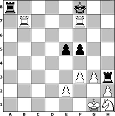 game notation in PGN-format [Event "1. Chess960/6"] [Site "www.myChess.de"] [Date "2007.03.01"] [Round "1"] [White "GPogrzeba@ (adv.)"] [Black "Morus@"] [Variant "Fischerrandom"] [SetUp "1"] [FEN "rbqkbrnn/pppppppp/8/8/8/8/PPPPPPPP/RBQKBRNN w KQkq - 0 1"] [WhitemyELO "1500"] [BlackmyELO "1500"] [Result "1-0"] [TimeControl "10/3456000"] [WhiteDays "184"] [BlackDays "151"] [MyChessNo "33161"] 1. Ng3 Nf6 2. Nf3 Ng6 3. c4 c5 4. Nf5 Rg8 5. d4 e6 6. Ne3 cxd4 7. Nxd4 Bf4 8. b3 Qc5 9. Bc3 d5 10. g3 Bxe3 11. Qxe3 O-O-O 12. O-O dxc4 13. bxc4 Ng4 14. Qf3 N6e5 15. Qe4 Ba4 16. Nb3 Qxc4 17. Rc1 Bc6 18. Qxc4 Nxc4 19. f3 Nge3 20. Bd4 e5 21. Bxa7 Kd7 22. Bxh7 Rh8 23. Bd3 Ra8 24. Bc5 b5 25. Bxe3 Nxe3 26. Rc5 Kd6 27. Bxb5 Bxb5 28. Rxb5 Rh3 29. Nd2 f5 30. Rb3 Nc2 31. Nc4+ Kc5 32. Rc1 Kxc4 33. Rxc2+ Kd5 34. Rd2+ Ke6 35. Rb6+ Kf7 36. Rd7+ Kg8 37. Rbb7 Rxa2 38. Rxg7+ Kf8 39. Rgc7 Ra8 40. Rf7+ 1-0 position notation in FEN-format r4k2/1R3R2/8/4pp2/8/5PPr/4P2P/6KN - - - 4 40 Captured white pieces: Captured black pieces: Click on a captured piece in order to display the desired move!