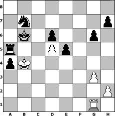 game notation in PGN-format [Event "Chess960 Open I 2014"] [Site "www.myChess.de"] [Date "2014.01.07"] [Round "1"] [White "rux"] [Black "Achimkogge"] [Variant "Fischerrandom"] [SetUp "1"] [FEN "rkqbbnrn/pppppppp/8/8/8/8/PPPPPPPP/RKQBBNRN w KQkq - 0 1"] [WhitemyELO "1519"] [BlackmyELO "1398"] [Result "0-1"] [TimeControl "10/3456000"] [WhiteDays "40"] [BlackDays "40"] [MyChessNo "92199"] 1. d3 e5 2. e3 d6 3. Bf3 Bg5 4. Qd2 c5 5. Qc3 Bc6 6. Qc4 b5 7. Qxf7 Nxf7 8. e4 g6 9. Nhg3 b4 10. a4 a5 11. c3 bxc3 12. Bxc3 Qa6 13. Be2 Ne6 14. d4 Qb6 15. Ra3 cxd4 16. Bc4 Nfd8 17. Rb3 Qxb3 18. Bxb3 dxc3 19. bxc3 Rf8 20. f3 Nc5 21. Kc2 Kc7 22. Bd5 Bxd5 23. exd5 Nxa4 24. Ne4 Bf4 25. g3 Bh6 26. Nfd2 Bxd2 27. Kxd2 Rxf3 28. Ke2 Nxc3+ 29. Kxf3 Nxe4 30. Kxe4 a4 31. Kd3 Kb6 32. Kc4 Ra5 33. Kb4 Nb7 0-1 position notation in FEN-format 8/1n5p/1k1p2p1/r2Pp3/pK6/6P1/7P/6R1 - - - 6 34 Captured white pieces: Captured black pieces: Click on a captured piece in order to display the desired move!