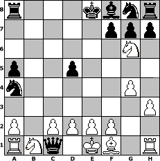 game notation in PGN-format [Event "Thema-2016-01"] [Site "www.myChess.de"] [Date "2016.02.11"] [Round "1"] [White "Achimkogge"] [Black "ChNe"] [ECO "A12"] [WhitemyELO "1424"] [BlackmyELO "1526"] [Result "0-1"] [TimeControl "10/2592000"] [WhiteDays "30"] [BlackDays "25"] [MyChessNo "102475"] 1. c4 c6 2. Nf3 d5 3. b3 Bf5 4. Nd4 Bg4 5. h3 Bh5 6. g4 Bg6 7. c5 Nd7 8. b4 a5 9. b5 e5 10. bxc6 bxc6 11. Nxc6 Qc7 12. Qa4 Nxc5 13. Nxe5+ Nxa4 14. Nxg6 Qxc1# 0-1 position notation in FEN-format r3kbnr/5ppp/6N1/p2p4/n5P1/7P/P1PPPP2/RNq1KB1R - KQkq - 0 15 Captured white pieces: Captured black pieces: Click on a captured piece in order to display the desired move!