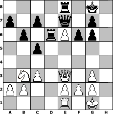 game notation in PGN-format [Event "Eine zentrale Er"] [Site "www.myChess.de"] [Date "2009.05.20"] [Round "2"] [White "murphy12"] [Black "Juliette2103"] [ECO "C67"] [WhitemyELO "1596"] [BlackmyELO "1498"] [Result "0-1"] [TimeControl "10/2592000"] [WhiteDays "90"] [BlackDays "29"] [MyChessNo "55951"] 1. e4 e5 2. Nf3 Nc6 3. Bb5 Nf6 4. O-O Nxe4 5. Re1 Nd6 6. Bxc6 dxc6 7. Nxe5 Be7 8. d4 O-O 9. Bf4 Bf5 10. Nd2 f6 11. Nef3 Nf7 12. c3 Bd6 13. Bg3 Bxg3 14. hxg3 Qd5 15. Nh4 Bd3 16. Re7 Qd6 17. Qe1 Ne5 18. Qe3 Qxe7 19. dxe5 Rad8 20. e6 Bg6 21. Nxg6 hxg6 22. Re1 Rfe8 23. Nf3 Rd6 24. Nd4 c5 25. Nb3 b6 0-1 position notation in FEN-format 4r1k1/p1p1q1p1/1p1rPpp1/2p5/8/1NP1Q1P1/PP2PPP1/4R1K1 - - - 0 26 Captured white pieces: Captured black pieces: Click on a captured piece in order to display the desired move!