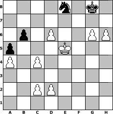 game notation in PGN-format [Event "Ende 2014"] [Site "www.myChess.de"] [Date "2014.12.20"] [Round "1"] [White "Tomino"] [Black "lotchi"] [ECO "D00"] [WhitemyELO "1564"] [BlackmyELO "1201"] [Result "1-0"] [TimeControl "10/2592000"] [WhiteDays "132"] [BlackDays "076"] [MyChessNo "97187"] 1. d4 d5 2. Bf4 Nc6 3. Nf3 Nf6 4. e3 Ne4 5. Nc3 a6 6. Bd3 Nxc3 7. bxc3 Bg4 8. h3 Bxf3 9. Qxf3 e6 10. O-O f6 11. e4 dxe4 12. Qxe4 Qd7 13. Rfe1 O-O-O 14. Qxe6 Qxe6 15. Rxe6 Bd6 16. Bxd6 cxd6 17. Rae1 Rd7 18. f4 Kc7 19. d5 Nd8 20. Re7 g6 21. g4 Rxe7 22. Rxe7+ Kc8 23. Kf2 a5 24. a4 g5 25. Rxh7 Rxh7 26. Bxh7 b6 27. fxg5 fxg5 28. Ke3 Nf7 29. Ke4 Kd7 30. Kf5 Ke7 31. Bg8 Nh6+ 32. Kxg5 Nxg8 33. Kg6 Nf6 34. c4 Ng8 35. g5 Kf8 36. h4 Ne7+ 37. Kf6 Ng8+ 38. Ke6 Ne7 39. h5 Nc8 40. Kd7 Ne7 41. Kxd6 Nf5+ 42. Ke5 Ng7 43. h6 Ne8 44. g6 Kg8 45. d6 1-0 position notation in FEN-format 4n1k1/8/1p1P2PP/p3K3/P1P5/8/2PP4/8 - - - 0 45 Captured white pieces: Captured black pieces: Click on a captured piece in order to display the desired move!