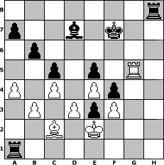 game notation in PGN-format [Event "chess960 f"] [Site "www.myChess.de"] [Date "2007.08.26"] [Round "2"] [White "reisinger"] [Black "tschulz"] [Variant "Fischerrandom"] [SetUp "1"] [FEN "bbrknqnr/pppppppp/8/8/8/8/PPPPPPPP/BBRKNQNR w KQkq - 0 1"] [WhitemyELO "1594"] [BlackmyELO "1526"] [Result "0-1"] [TimeControl "10/1728000"] [WhiteDays "96"] [BlackDays "74"] [MyChessNo "37593"] 1. c4 c5 2. b3 b6 3. Ngf3 Nh6 4. g3 d5 5. Qg2 d4 6. Nd3 Nf6 7. O-O Qe8 8. e3 Nf5 9. Nde5 Bxe5 10. Bxf5 e6 11. Bd3 Qc6 12. e4 Bb8 13. Ng5 O-O 14. Rce1 h6 15. Nh3 Ng4 16. Bc2 Rcd8 17. d3 f5 18. f3 Ne3 19. Rxe3 dxe3 20. Qe2 f4 21. g4 e5 22. Kh1 Qf6 23. Rg1 Qh4 24. Qg2 Bc6 25. g5 Bd7 26. gxh6 Qxh6 27. Qg5 Qxg5 28. Nxg5 Rf6 29. h4 Rh6 30. Kg2 Rxh4 31. a3 Rh5 32. Kf1 Rh2 33. Rg2 Rh1+ 34. Ke2 Rxa1 35. a4 Bd6 36. Rh2 Be7 37. Nh3 g5 38. Nxg5 Bxg5 39. Rg2 Kf7 40. Rxg5 Rh8 0-1 position notation in FEN-format 7r/p2b1k2/1p6/2p1p1R1/P1P1Pp2/1P1PpP2/2B1K3/r7 - - - 1 41 Captured white pieces: Captured black pieces: Click on a captured piece in order to display the desired move!