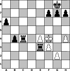 game notation in PGN-format [Event "Turnier zum Tag der deutschen Einheit 2015"] [Site "www.myChess.de"] [Date "2015.10.03"] [Round "1"] [White "borsti"] [Black "ndziemba"] [ECO "C65"] [WhitemyELO "1302"] [BlackmyELO "1407"] [Result "0-1"] [TimeControl "10/1728000"] [WhiteDays "79"] [BlackDays "78"] [MyChessNo "100625"] 1. e4 e5 2. Nf3 Nc6 3. Bb5 Nf6 4. d3 Bc5 5. O-O O-O 6. Nc3 a6 7. Bxc6 dxc6 8. Nxe5 Re8 9. Bf4 Bd4 10. Nc4 c5 11. Rb1 Be6 12. Ne2 b5 13. Ne5 Bxe5 14. Bxe5 c4 15. a3 c5 16. Nc3 cxd3 17. Qxd3 Nd7 18. Bd6 Bc4 19. Qe3 Bxf1 20. Rxf1 Nb6 21. Bxc5 Nc4 22. Qc1 Qd2 23. Rd1 Qxc1 24. Rxc1 Nxb2 25. f3 Rec8 26. Bd4 Rc4 27. Ne2 Na4 28. c3 Rd8 29. Nf4 Rdxd4 30. Kf2 Nxc3 31. Ke3 Nd1+ 32. Rxd1 Rxd1 33. Nd5 Ra1 34. h4 Rxa3+ 35. Kf4 b4 36. Ne3 Rxe3 0-1 position notation in FEN-format 6k1/5ppp/p7/8/1pr1PK1P/4rP2/6P1/8 - - - 0 37 Captured white pieces: Captured black pieces: Click on a captured piece in order to display the desired move!