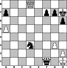 game notation in PGN-format [Event "mySchach.de - 1. Turnier 2003"] [Site "www.myChess.de"] [Date "2003.07.25"] [Round "1"] [White "duc"] [Black "larlinde"] [ECO "A50"] [WhitemyELO "1487"] [BlackmyELO "1706"] [Result "0-1"] [TimeControl "10/2592000"] [WhiteDays "164"] [BlackDays "116"] [MyChessNo "388"] 1. d4 Nf6 2. c4 d5 3. c5 Nc6 4. Nf3 e5 5. e3 e4 6. Nfd2 b6 7. Bb5 Bd7 8. Qa4 Ne7 9. Nc3 c6 10. Be2 bxc5 11. dxc5 Ng6 12. b4 Qc7 13. Ba3 Be7 14. O-O O-O 15. Rac1 Bg4 16. b5 Bxe2 17. Nxe2 Ng4 18. g3 cxb5 19. Qxb5 Rab8 20. Qa4 N6e5 21. Nd4 Nd3 22. Rc3 Nge5 23. c6 Nb2 24. Bxb2 Rxb2 25. N4b3 Rb8 26. Rd1 Bb4 27. Rcc1 Bxd2 28. Nxd2 Rxd2 29. Rxd2 Nf3+ 30. Kg2 Nxd2 31. Qd4 Nc4 32. Qxd5 Nd6 33. Rd1 Rd8 34. f3 exf3+ 35. Kxf3 h6 36. e4 Nb7 37. Qb3 Rxd1 38. Qxd1 Qxc6 39. a4 Nc5 40. Qd8+ Kh7 41. a5 Qxe4+ 42. Kf2 Nd3+ 43. Kf1 Qf3+ 44. Kg1 Qf2+ 45. Kh1 Qf1# 0-1 position notation in FEN-format 3Q4/p4ppk/7p/P7/8/3n2P1/7P/5q1K - - - 8 46 Captured white pieces: ![]() ![]() ![]() ![]() ![]() ![]() ![]() ![]() ![]() ![]() ![]() ![]() ![]() ![]() ![]() Captured black pieces: ![]() ![]() ![]() ![]() ![]() ![]() ![]() ![]() ![]() ![]() ![]() ![]() ![]() ![]() ![]() Click on a captured piece in order to display the desired move!