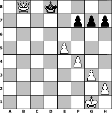 game notation in PGN-format [Event "BENONI"] [Site "www.myChess.de"] [Date "2005.06.20"] [Round "2"] [White "Basal"] [Black "Antaeus"] [ECO "A56"] [WhitemyELO "1843"] [BlackmyELO "1674"] [Result "1-0"] [TimeControl "10/864000"] [WhiteDays "09"] [BlackDays "10"] [MyChessNo "14218"] 1. d4 Nf6 2. c4 c5 3. Nf3 cxd4 4. Nxd4 Nc6 5. Nc3 e6 6. g3 Bc5 7. Nb3 Bb4 8. Bg2 O-O 9. O-O Bxc3 10. bxc3 d6 11. Ba3 Ne8 12. e4 Qf6 13. Rc1 e5 14. c5 Nc7 15. cxd6 Nb5 16. Bc5 Rd8 17. Rc2 Be6 18. c4 Nbd4 19. Rc1 Qg6 20. Ba3 Rac8 21. c5 Nxb3 22. axb3 Nd4 23. b4 Bb3 24. Qd2 Qh5 25. Rfe1 Be6 26. Bb2 Nb3 27. Qd1 Qg5 28. Rc3 Nd4 29. f4 Qh6 30. Ra3 b6 31. Bxd4 exd4 32. Qxd4 a5 33. bxa5 bxc5 34. Qd3 c4 35. Qd4 Bh3 36. e5 Bxg2 37. Kxg2 Qe6 38. Rc1 Qg4 39. Rc2 Qd7 40. Rxc4 Qb7+ 41. Rf3 Qa8 42. Rxc8 Rxc8 43. Qd2 Qe4 44. Qd3 Qa8 45. a6 Re8 46. d7 Rd8 47. Qb5 Qe4 48. Qb6 Qc2+ 49. Rf2 Qe4+ 50. Kg1 Qa8 51. Qb7 Qxb7 52. axb7 Kf8 53. Rc2 Ke7 54. Rc8 Kxd7 55. Rxd8+ Kxd8 56. b8=Q+ 1-0 position notation in FEN-format 1Q1k4/5ppp/8/4P3/5P2/6P1/7P/6K1 - - - 0 56 Captured white pieces: ![]() ![]() ![]() ![]() ![]() ![]() ![]() ![]() ![]() ![]() ![]() ![]() ![]() ![]() ![]() Captured black pieces: ![]() ![]() ![]() ![]() ![]() ![]() ![]() ![]() ![]() ![]() ![]() ![]() ![]() ![]() ![]() Click on a captured piece in order to display the desired move!