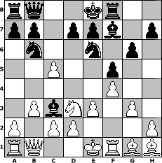 game notation in PGN-format [Event "960 er Freunde"] [Site "www.myChess.de"] [Date "2006.11.08"] [Round "1"] [White "Seneca"] [Black "FreshPrinc2"] [Variant "Fischerrandom"] [SetUp "1"] [FEN "rqnnkrbb/pppppppp/8/8/8/8/PPPPPPPP/RQNNKRBB w KQkq - 0 1"] [WhitemyELO "1720"] [BlackmyELO "1585"] [Result "0-1"] [TimeControl "10/3456000"] [WhiteDays "38"] [BlackDays "31"] [MyChessNo "29834"] 1. d4 f5 2. Nd3 Nb6 3. g3 Bf7 4. Nc3 g6 5. f4 Ne6 6. e3 c6 7. b3 c5 8. dxc5 Bxc3+ 0-1 position notation in FEN-format rq2kr2/pp1ppb1p/1n2n1p1/2P2p2/5P2/1PbNP1P1/P1PP3P/RQ2KRBB - KQkq - 0 9 Captured white pieces: ![]() ![]() ![]() ![]() ![]() ![]() ![]() ![]() ![]() ![]() ![]() ![]() ![]() ![]() ![]() Captured black pieces: ![]() ![]() ![]() ![]() ![]() ![]() ![]() ![]() ![]() ![]() ![]() ![]() ![]() ![]() ![]() Click on a captured piece in order to display the desired move!