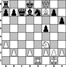 game notation in PGN-format [Event "Rechnerfrei A"] [Site "www.myChess.de"] [Date "2010.02.05"] [Round "1"] [White "beowulf"] [Black "Haneken"] [ECO "A40"] [WhitemyELO "1314"] [BlackmyELO "1410"] [Result "1-0"] [TimeControl "10/1728000"] [WhiteDays "59"] [BlackDays "49"] [MyChessNo "62921"] 1. d4 e6 2. c4 Nf6 3. Nf3 d5 4. Bg5 h6 5. Bxf6 Qxf6 6. a3 dxc4 7. e4 Nc6 8. Bxc4 Qg6 9. O-O Qxe4 10. Nc3 Qf4 11. Re1 Be7 12. Re4 Qd6 13. d5 f5 14. Nb5 Qd8 15. Re2 exd5 16. Qxd5 Rf8 17. Rae1 Bd7 18. Nd6+ cxd6 19. Qxd6 Rf6 20. Qd5 Qc7 21. Qg8+ Rf8 22. Rxe7+ Nxe7 23. Bf7+ Kd8 24. Qxf8+ 1-0 position notation in FEN-format r2k1Q2/ppqbnBp1/7p/5p2/8/P4N2/1P1P1PPP/4R1K1 - - - 0 24 Captured white pieces: Captured black pieces: Click on a captured piece in order to display the desired move!