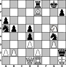 game notation in PGN-format [Event "Faires Schach"] [Site "www.myChess.de"] [Date "2007.03.25"] [Round "1"] [White "bluescreenlover"] [Black "paul"] [ECO "C41"] [WhitemyELO "1370"] [BlackmyELO "1329"] [Result "0-1"] [TimeControl "10/3456000"] [WhiteDays "108"] [BlackDays "070"] [MyChessNo "33768"] 1. e4 e5 2. Nf3 d6 3. Bc4 Be6 4. Bxe6 fxe6 5. d3 Nc6 6. O-O Nf6 7. Be3 d5 8. Bg5 Be7 9. Nc3 d4 10. Nb5 a6 11. Na3 O-O 12. Nc4 Bd6 13. c3 b5 14. Nxd6 cxd6 15. Qb3 d5 16. exd5 exd5 17. cxd4 exd4 18. Rae1 Qd6 19. g3 Ng4 20. Bf4 Qc5 21. Re6 g5 22. Bd6 Na5 23. Qd1 Qc8 24. Bxf8 Qxe6 25. Nxg5 Qf5 26. Be7 Re8 27. Re1 Qxf2+ 28. Kh1 Qxh2# 0-1 position notation in FEN-format 4r1k1/4B2p/p7/np1p2N1/3p2n1/3P2P1/PP2P2q/3QR2K - - - 0 29 Captured white pieces: Captured black pieces: Click on a captured piece in order to display the desired move!