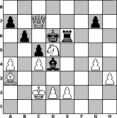 game notation in PGN-format [Event "Tanz in den Mai."] [Site "www.myChess.de"] [Date "2017.04.28"] [Round "1"] [White "faustballer"] [Black "Achimkogge"] [ECO "C51"] [WhitemyELO "1508"] [BlackmyELO "1384"] [Result "1-0"] [TimeControl "10/2592000"] [WhiteDays "119"] [BlackDays "117"] [MyChessNo "107970"] 1. e4 e5 2. Nf3 Nc6 3. Bc4 Bc5 4. b4 d5 5. Bxd5 Nxb4 6. Nc3 c6 7. Bb3 Bg4 8. h3 Bh5 9. a3 Na6 10. g4 Bg6 11. Nxe5 Qh4 12. Qf3 Bd4 13. Nxg6 hxg6 14. Bxf7+ Kd7 15. Bxg6 Ne7 16. Bf5+ Nxf5 17. Qxf5+ Ke7 18. a4 Raf8 19. Ba3+ c5 20. Nd5+ Kd6 21. Qg6+ Kd7 22. O-O-O Qxf2 23. c3 Be5 24. Kc2 Qf3 25. Rdf1 Qxf1 26. Rxf1 Rxf1 27. Qg5 Re8 28. Qe3 b6 29. Qd3 Nb4+ 30. Nxb4+ Bd6 31. Qxf1 Rxe4 32. Qf5+ Re6 33. Nd5 Be5 34. c4 Bd4 35. Qf7+ Kd6 36. Qc7# 1-0 position notation in FEN-format 8/p1Q3p1/1p1kr3/2pN4/P1Pb2P1/B6P/2KPP3/8 - - - 4 36 Captured white pieces: Captured black pieces: Click on a captured piece in order to display the desired move!
