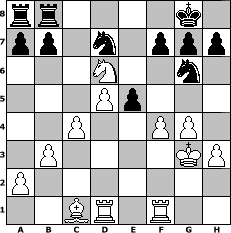 game notation in PGN-format [Event "Wrixum - Open die XIII"] [Site "www.myChess.de"] [Date "2016.09.28"] [Round "1"] [White "Grubengeist"] [Black "Ziegert"] [ECO "B05"] [WhitemyELO "1933"] [BlackmyELO "1490"] [Result "1-0"] [TimeControl "10/2592000"] [WhiteDays "25"] [BlackDays "00"] [MyChessNo "105055"] 1. e4 Nf6 2. e5 Nd5 3. d4 d6 4. Nf3 Bg4 5. Be2 e6 6. O-O Be7 7. c4 Nb6 8. b3 O-O 9. h3 Bf5 10. Nc3 Nc6 11. exd6 cxd6 12. Bd3 Bxd3 13. Qxd3 Bf6 14. Ba3 Re8 15. Rad1 e5 16. d5 Ne7 17. Ne4 Nf5 18. Nxf6+ Qxf6 19. Nd2 Nd7 20. g4 Nh4 21. Ne4 Nf3+ 22. Kg2 Nh4+ 23. Kh1 Qf4 24. Bc1 Qf3+ 25. Qxf3 Nxf3 26. Kg2 Nh4+ 27. Kg3 Ng6 28. Nxd6 Reb8 29. f4 1-0 position notation in FEN-format rr4k1/pp1n1ppp/3N2n1/3Pp3/2P2PP1/1P4KP/P7/2BR1R2 - - - 0 29 Captured white pieces: Captured black pieces: Click on a captured piece in order to display the desired move!