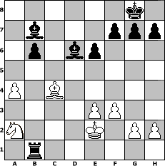 game notation in PGN-format [Event "Ferienspass"] [Site "www.myChess.de"] [Date "2016.07.25"] [Round "1"] [White "FrankB"] [Black "ChNe"] [ECO "A46"] [WhitemyELO "1664"] [BlackmyELO "1625"] [Result "0-1"] [TimeControl "10/864000"] [WhiteDays "10"] [BlackDays "09"] [MyChessNo "104309"] 1. d4 Nf6 2. Nf3 d5 3. e3 e6 4. a3 Be7 5. c4 O-O 6. Nc3 b6 7. Be2 dxc4 8. Bxc4 Bb7 9. O-O c5 10. Be2 Nbd7 11. dxc5 Nxc5 12. b4 Qxd1 13. Rxd1 Nb3 14. Rb1 Nxc1 15. Rbxc1 a5 16. bxa5 Rxa5 17. a4 Rc8 18. Nd2 Rac5 19. Na2 Rc2 20. Bc4 Rb2 21. Kf1 Rd8 22. Nb1 Rxd1+ 23. Rxd1 Ne4 24. f3 Nd6 25. Rxd6 Rxb1+ 26. Ke2 Bxd6 0-1 position notation in FEN-format 6k1/1b3ppp/1p1bp3/8/P1B5/4PP2/N3K1PP/1r6 - - - 0 27 Captured white pieces: Captured black pieces: Click on a captured piece in order to display the desired move!