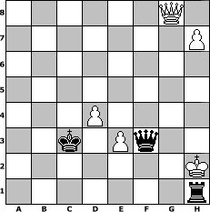 game notation in PGN-format [Event "1.Chess in Friendship"] [Site "www.myChess.de"] [Date "2004.08.10"] [Round "2"] [White "OwainGwynedd"] [Black "Master1"] [ECO "A00"] [WhitemyELO "1263"] [BlackmyELO "1186"] [Result "0-1"] [TimeControl "10/2592000"] [WhiteDays "203"] [BlackDays "201"] [MyChessNo "6128"] 1. e3 d5 2. d3 f5 3. c3 e5 4. a3 g6 5. g3 Nf6 6. h3 Bc5 7. Ne2 Be6 8. Bg2 e4 9. Nf4 Nc6 10. Nxe6 Qd6 11. Nxc5 Qxc5 12. b4 Qd6 13. Ra2 O-O-O 14. Qc2 Rhe8 15. O-O h5 16. Rd1 g5 17. b5 Ne5 18. d4 Nf3+ 19. Bxf3 exf3 20. Qxf5+ Nd7 21. Qxg5 Nf6 22. Qf5+ Kb8 23. Qxf3 Rf8 24. a4 Ne4 25. Ba3 Rxf3 26. Bxd6 cxd6 27. Rf1 Rc8 28. Ra3 Rcf8 29. Ra2 Nxg3 30. Re1 Rg8 31. Kg2 Rff8 32. fxg3 h4 33. g4 Rf6 34. Rf2 Rxf2+ 35. Kxf2 Rf8+ 36. Ke2 a6 37. b6 a5 38. Rf1 Rc8 39. Rf5 Rc6 40. Rxd5 Rxb6 41. Nd2 Kc7 42. Rxa5 Kc6 43. Rb5 Ra6 44. a5 Kxb5 45. Nf3 Rxa5 46. Nxh4 Ra2+ 47. Kf3 Kc4 48. Nf5 Kxc3 49. h4 b5 50. g5 d5 51. g6 Ra1 52. g7 Rg1 53. Kf4 b4 54. h5 b3 55. h6 b2 56. Ke5 b1=Q 57. h7 Qb8+ 58. Kxd5 Qd8+ 59. Ke5 Qa5+ 60. Kf4 Rf1+ 61. Kg3 Qe5+ 62. Kg2 Qxf5 63. g8=Q Qf3+ 64. Kh2 Rf2+ 65. Kg1 Rf1+ 66. Kh2 Rh1# 0-1 position notation in FEN-format 6Q1/7P/8/8/3P4/2k1Pq2/7K/7r - - - 7 67 Captured white pieces: Captured black pieces: Click on a captured piece in order to display the desired move!