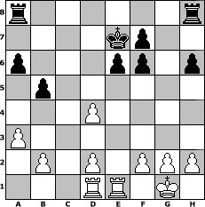 game notation in PGN-format [Event "> 1500"] [Site "www.myChess.de"] [Date "2010.03.18"] [Round "1"] [White "Master1"] [Black "Whiskey40"] [ECO "A40"] [WhitemyELO "1261"] [BlackmyELO "1445"] [Result "1/2-1/2"] [TimeControl "10/2592000"] [WhiteDays "87"] [BlackDays "73"] [MyChessNo "64109"] 1. d4 c6 2. c4 d5 3. Bf4 Nd7 4. cxd5 cxd5 5. Nc3 e6 6. Nf3 Bb4 7. Qb3 Be7 8. a3 h6 9. e4 dxe4 10. Nxe4 Ngf6 11. Nxf6+ Bxf6 12. Bb5 a6 13. Bxd7+ Qxd7 14. O-O b5 15. Rad1 Bb7 16. Be5 Bd5 17. Qe3 Bxf3 18. Qxf3 Qd8 19. Bxf6 gxf6 20. Qc6+ Kf8 21. Qc5+ Qe7 22. Qxe7+ Kxe7 23. Rfe1 1/2-1/2 position notation in FEN-format r6r/4kp2/p3pp1p/1p6/3P4/P7/1P1P1PPP/3RR1K1 - - - 1 23 Captured white pieces: Captured black pieces: Click on a captured piece in order to display the desired move!