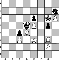game notation in PGN-format [Event "Abwrackturnier"] [Site "www.myChess.de"] [Date "2009.04.16"] [Round "1"] [White "neve"] [Black "Andreas"] [ECO "D31"] [WhitemyELO "1557"] [BlackmyELO "1625"] [Result "0-1"] [TimeControl "10/864000"] [WhiteDays "60"] [BlackDays "37"] [MyChessNo "54921"] 1. d4 d5 2. c4 e6 3. Nc3 c6 4. Nf3 g6 5. Bg5 f6 6. Bf4 Nd7 7. h4 Bb4 8. e3 Ne7 9. Bd3 b6 10. Qa4 Bxc3+ 11. bxc3 Bb7 12. Bh6 Kf7 13. Qc2 dxc4 14. Bxc4 b5 15. Be2 Rc8 16. Qd1 Nf5 17. Bf4 Qb6 18. e4 Ne7 19. Be3 c5 20. Qb1 a6 21. Bd3 c4 22. Bc2 Qd8 23. a4 Bc6 24. axb5 axb5 25. h5 Qc7 26. Nd2 Rb8 27. Kf1 g5 28. h6 Ng6 29. Rh3 Nf4 30. Rf3 Ng6 31. Bxg5 Ra8 32. Be3 Rxa1 33. Qxa1 Ra8 34. Qb2 Ra6 35. Rg3 Qb8 36. e5 fxe5 37. Bxg6+ hxg6 38. Qb1 Nf8 39. dxe5 Qa8 40. Ke2 Ra2 41. Bc5 Be4 42. Qxb5 Qd5 43. Ke3 Rxd2 44. Kf4 Rxf2+ 45. Bxf2 Qxb5 46. Kxe4 Qd5+ 47. Kf4 Nh7 48. Bd4 g5+ 49. Ke3 Kg6 0-1 position notation in FEN-format 8/7n/4p1kP/3qP1p1/2pB4/2P1K1R1/6P1/8 - - - 2 50 Captured white pieces: ![]() ![]() ![]() ![]() ![]() ![]() ![]() ![]() ![]() ![]() ![]() ![]() ![]() ![]() ![]() Captured black pieces: ![]() ![]() ![]() ![]() ![]() ![]() ![]() ![]() ![]() ![]() ![]() ![]() ![]() ![]() ![]() Click on a captured piece in order to display the desired move!