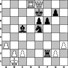 game notation in PGN-format [Event "Schon wieder."] [Site "www.myChess.de"] [Date "2017.10.12"] [Round "1"] [White "Achimkogge"] [Black "Winston"] [ECO "D00"] [WhitemyELO "1340"] [BlackmyELO "1443"] [Result "1-0"] [TimeControl "10/2592000"] [WhiteDays "145"] [BlackDays "149"] [MyChessNo "109904"] 1. d4 d5 2. e4 dxe4 3. Nc3 Nf6 4. f3 exf3 5. Qxf3 Qxd4 6. Nge2 Qb6 7. Nd4 Qxd4 8. Be3 Qb6 9. Bxb6 a6 10. Bxc7 Nc6 11. Qd3 Bd7 12. Nd5 Nxd5 13. Qxd5 Rc8 14. Bb6 e6 15. Qb3 Be7 16. O-O-O h5 17. Qd3 Ne5 18. Qd4 Bf6 19. Qd6 h4 20. h3 Rh5 21. Bc5 Rxc5 22. Qb8+ Rc8 23. Qxb7 Rf5 24. Bxa6 Bg5+ 25. Kb1 Rd8 26. a3 Rf2 27. Rhg1 Bd2 28. Qe4 f6 29. Qh7 Kf7 30. Qxh4 Be3 31. Qh5+ Ng6 32. Qa5 Ke7 33. Qb4+ Ke8 34. Bb5 Ne5 35. Bxd7+ Rxd7 36. Qb8+ Ke7 37. Qb4+ Ke8 38. Qb8+ Ke7 39. Rxd7+ Nxd7 40. Qb4+ Bc5 41. Qg4 Kf7 42. Qh5+ Ke7 43. Qg6 Kf8 44. Rd1 Ne5 45. Rd8+ Ke7 46. Qe8# 1-0 position notation in FEN-format 3RQ3/4k1p1/4pp2/2b1n3/8/P6P/1PP2rP1/1K6 - - - 13 46 Captured white pieces: Captured black pieces: Click on a captured piece in order to display the desired move!