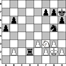 game notation in PGN-format [Event "5. Wikinger-Meisterschaft, Vorrunde A"] [Site "www.myChess.de"] [Date "2009.03.23"] [Round "1"] [White "werderfan"] [Black "Greenhorn"] [ECO "D50"] [WhitemyELO "1487"] [BlackmyELO "1608"] [Result "1/2-1/2"] [TimeControl "10/2592000"] [WhiteDays "118"] [BlackDays "135"] [MyChessNo "54170"] 1. d4 d5 2. c4 e6 3. Nc3 Nf6 4. Bg5 h6 5. Bh4 Be7 6. Nf3 O-O 7. e3 c5 8. cxd5 cxd4 9. Qxd4 Nxd5 10. Bxe7 Qxe7 11. Nxd5 exd5 12. Qxd5 Rd8 13. Qb3 b6 14. Be2 Be6 15. Qc3 Rc8 16. Qd2 Nd7 17. O-O Rc7 18. Rac1 Nc5 19. Qb4 Bxa2 20. Nd4 Bd5 21. Bf3 Rd8 22. Bxd5 Rxd5 23. Rfd1 Rcd7 24. Rc2 Qe4 25. Rcd2 Rg5 26. g3 Rg6 27. Qb5 a6 28. Qb4 a5 29. Qc3 Rgd6 30. Nb3 Rxd2 31. Rxd2 Rc7 32. Rd4 Qb1+ 33. Kg2 Ne6 34. Rd8+ Kh7 35. Qd3+ Qxd3 36. Rxd3 Ng5 37. Rd6 Rc2 38. Rd2 Rc6 39. Nd4 Rd6 40. Nf3 Rxd2 1/2-1/2 position notation in FEN-format 8/5ppk/1p5p/p5n1/8/4PNP1/1P1r1PKP/8 - - - 0 41 Captured white pieces: Captured black pieces: Click on a captured piece in order to display the desired move!