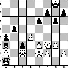 game notation in PGN-format [Event "Zwischendurch mal ein paar eigene Z"] [Site "www.myChess.de"] [Date "2009.06.25"] [Round "1"] [White "Zoidberg"] [Black "Plaidroller"] [ECO "A35"] [WhitemyELO "1849"] [BlackmyELO "1806"] [Result "0-1"] [TimeControl "10/1728000"] [WhiteDays "71"] [BlackDays "75"] [MyChessNo "56912"] 1. c4 c5 2. Nc3 Nc6 3. Nf3 g6 4. d3 Bg7 5. Bd2 Nf6 6. g3 d5 7. cxd5 Nxd5 8. Bg2 O-O 9. O-O b6 10. Rc1 Bb7 11. Nxd5 Qxd5 12. b3 Rad8 13. Be3 Nd4 14. Nh4 Qd7 15. Bxb7 Qxb7 16. Bxd4 cxd4 17. Qd2 Rc8 18. Rxc8 Rxc8 19. Rc1 Rc3 20. Rxc3 dxc3 21. Qc2 b5 22. b4 Qa6 23. Ng2 Qa3 24. e3 Qxb4 25. d4 Qb2 26. Ne1 a5 27. Kf1 e6 28. Ke2 Bf8 29. Kd3 Qa1 30. Nf3 Ba3 31. Ke2 a4 0-1 position notation in FEN-format 6k1/5p1p/4p1p1/1p6/p2P4/b1p1PNP1/P1Q1KP1P/q7 - - - 0 32 Captured white pieces: Captured black pieces: Click on a captured piece in order to display the desired move!