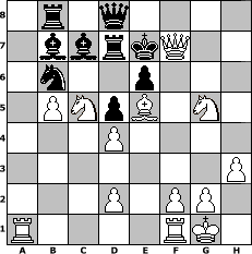 game notation in PGN-format [Event "Mit Dame Gambit ins Fr"] [Site "www.myChess.de"] [Date "2006.01.31"] [Round "1"] [White "Naunhofer"] [Black "Andylein1989"] [ECO "D10"] [WhitemyELO "1734"] [BlackmyELO "1368"] [Result "1-0"] [TimeControl "10/864000"] [WhiteDays "10"] [BlackDays "10"] [MyChessNo "22099"] 1. d4 d5 2. c4 c6 3. e3 Nf6 4. Nf3 Nbd7 5. Nc3 e6 6. Be2 Bb4 7. Qc2 O-O 8. O-O Re8 9. a3 Ba5 10. b4 Bc7 11. h3 b6 12. e4 b5 13. cxb5 cxb5 14. Bxb5 Re7 15. Bg5 Nb6 16. Bc6 Rb8 17. e5 Bd7 18. exf6 gxf6 19. Bxf6 Bxc6 20. Ng5 Kf8 21. Qxh7 Ke8 22. a4 a6 23. b5 axb5 24. axb5 Bb7 25. Na4 Qd6 26. Be5 Qd8 27. Nc5 Rd7 28. Qg8+ Ke7 29. Qxf7# 1-0 position notation in FEN-format 1r1q4/1bbrkQ2/1n2p3/1PNpB1N1/3P4/7P/3P1PP1/R4RK1 - - - 0 29 Captured white pieces: ![]() ![]() ![]() ![]() ![]() ![]() ![]() ![]() ![]() ![]() ![]() ![]() ![]() ![]() ![]() Captured black pieces: ![]() ![]() ![]() ![]() ![]() ![]() ![]() ![]() ![]() ![]() ![]() ![]() ![]() ![]() ![]() Click on a captured piece in order to display the desired move!