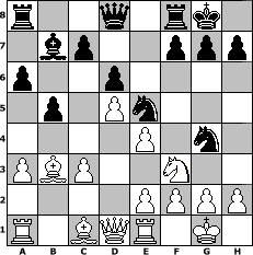 game notation in PGN-format [Event "Ja, is denn heut scho Weihnachten?"] [Site "www.myChess.de"] [Date "2014.12.06"] [Round "1"] [White "Ziegert"] [Black "Schefsche"] [ECO "C70"] [WhitemyELO "1226"] [BlackmyELO "1378"] [Result "0-1"] [TimeControl "10/2592000"] [WhiteDays "00"] [BlackDays "52"] [MyChessNo "97024"] 1. e4 e5 2. Nf3 Nc6 3. Bb5 a6 4. Ba4 b5 5. Bb3 Nf6 6. O-O Bc5 7. c3 O-O 8. Re1 Ng4 9. d4 exd4 10. cxd4 Bb4 11. Nc3 d6 12. a3 Bxc3 13. bxc3 Bb7 14. d5 Nce5 0-1 position notation in FEN-format r2q1rk1/1bp2ppp/p2p4/1p1Pn3/4P1n1/PBP2N2/4PPPP/R1BQR1K1 - - - 1 15 Captured white pieces: ![]() ![]() ![]() ![]() ![]() ![]() ![]() ![]() ![]() ![]() ![]() ![]() ![]() ![]() ![]() Captured black pieces: ![]() ![]() ![]() ![]() ![]() ![]() ![]() ![]() ![]() ![]() ![]() ![]() ![]() ![]() ![]() Click on a captured piece in order to display the desired move!