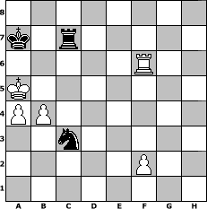 game notation in PGN-format [Event "3. Chess960/1"] [Site "www.myChess.de"] [Date "2009.04.06"] [Round "1"] [White "rtu"] [Black "taxi7416"] [Variant "Fischerrandom"] [SetUp "1"] [FEN "rqknnrbb/pppppppp/8/8/8/8/PPPPPPPP/RQKNNRBB w KQkq - 0 1"] [WhitemyELO "1520"] [BlackmyELO "1504"] [Result "1/2-1/2"] [TimeControl "10/3456000"] [WhiteDays "082"] [BlackDays "237"] [MyChessNo "54660"] 1. f4 f5 2. c3 g6 3. Ne3 c6 4. Qc2 Nf6 5. g3 Qc7 6. d3 e5 7. fxe5 Qxe5 8. Qa4 Bg7 9. O-O-O Bh6 10. N1c2 Ng4 11. d4 Qe7 12. Rd3 f4 13. gxf4 Bxf4 14. Rfd1 a5 15. d5 b5 16. Qa3 Qxa3 17. Nxa3 c5 18. Nxb5 c4 19. Nd6+ Bxd6 20. Nxc4 Bf4+ 21. e3 Bc7 22. d6 Bxc4 23. dxc7 Nc6 24. Rxd7 Nge5 25. Rxh7 Ra7 26. b3 Be2 27. Rd8+ Nxd8 28. cxd8=Q+ Rxd8 29. Rxa7 Rd1+ 30. Kc2 Rxg1 31. Bd5 Ng4 32. Kd2 Rd1+ 33. Kxe2 Rxd5 34. h4 Rf5 35. a4 Rc5 36. Kd3 Rh5 37. Kd4 Nh2 38. b4 Nf3+ 39. Ke4 Nd2+ 40. Kd3 Rd5+ 41. Ke2 Nc4 42. Ra6 Rd2+ 43. Ke1 Kb7 44. Rxa5 Rh2 45. Rb5+ Ka7 46. Rg5 Rxh4 47. Ke2 Rh3 48. Kd3 Nxe3 49. Rxg6 Nd1+ 50. Kc4 Rxc3+ 51. Kb5 Rc7 52. Ka5 Nc3 53. Rf6 1/2-1/2 position notation in FEN-format 8/k1r5/5R2/K7/PP6/2n5/5P2/8 - - - 5 53 Captured white pieces: Captured black pieces: Click on a captured piece in order to display the desired move!